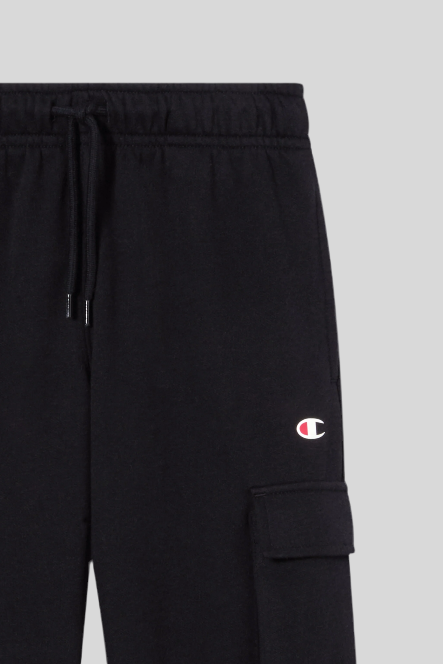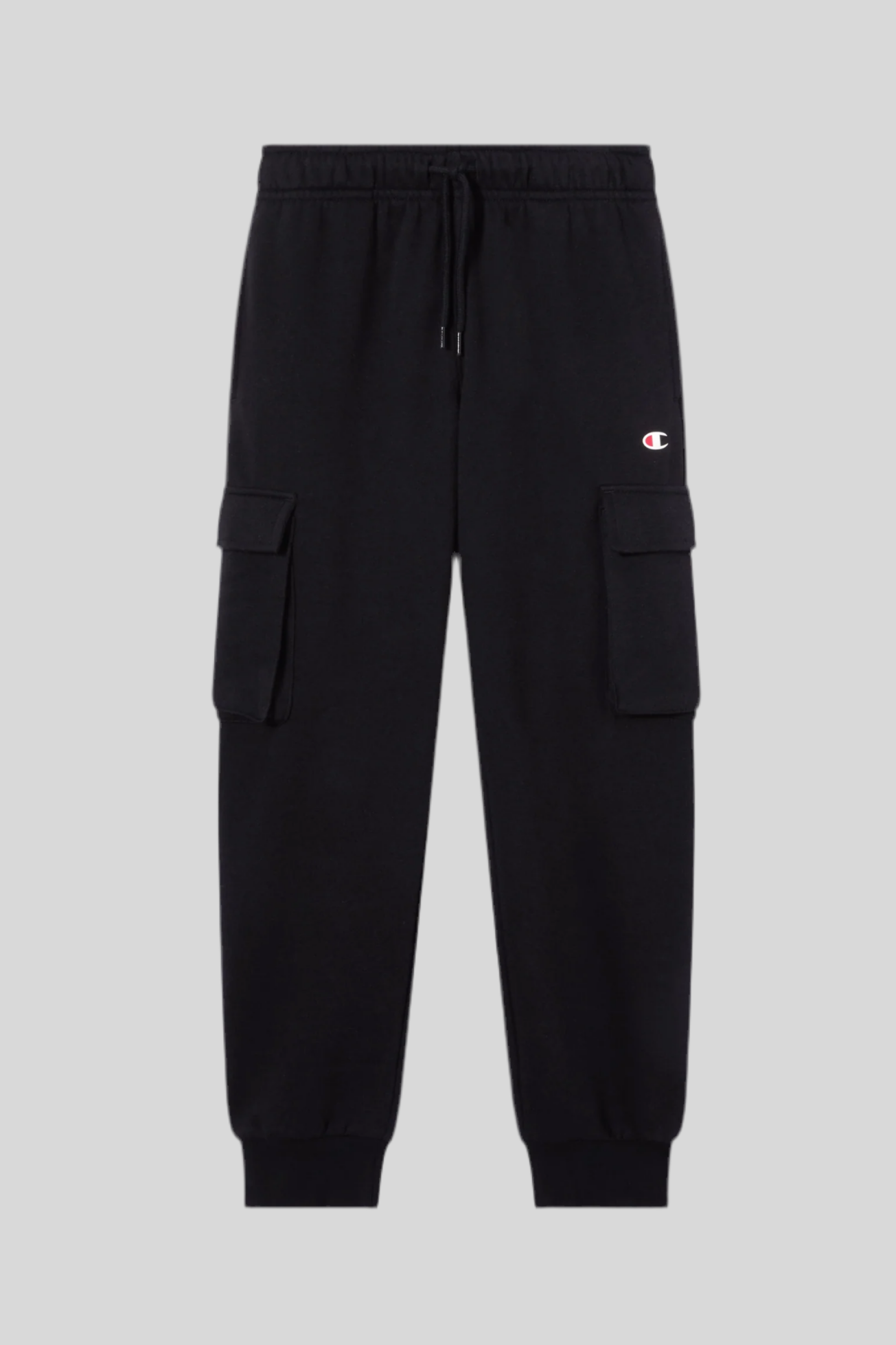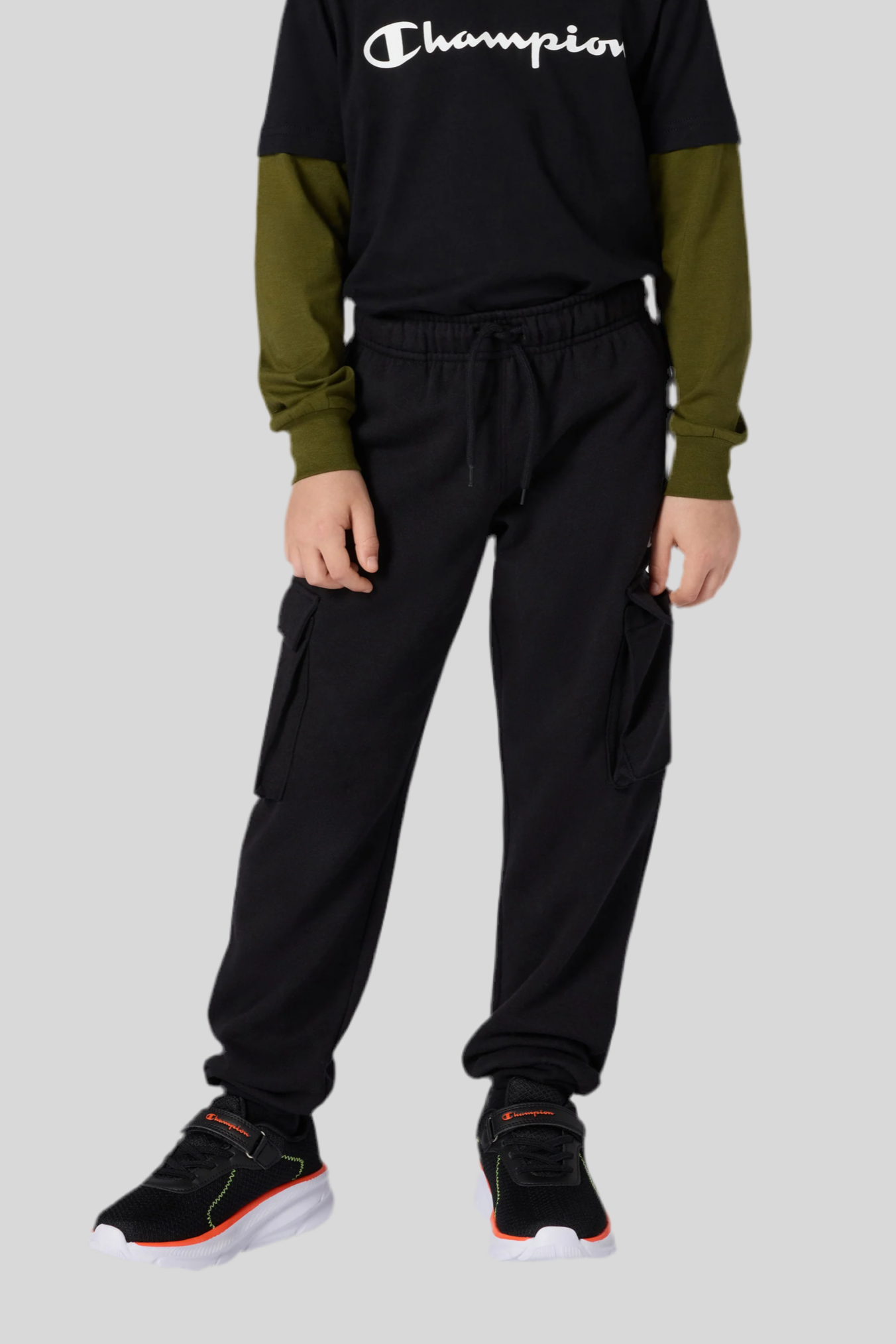 Estas calças cargo cardadas infantis Champion são confeccionadas em fleece leve e compacto de 240 g/m², composto por 73% algodão e 27% poliéster, garantindo toque ultra macio, resistência e conforto térmico.