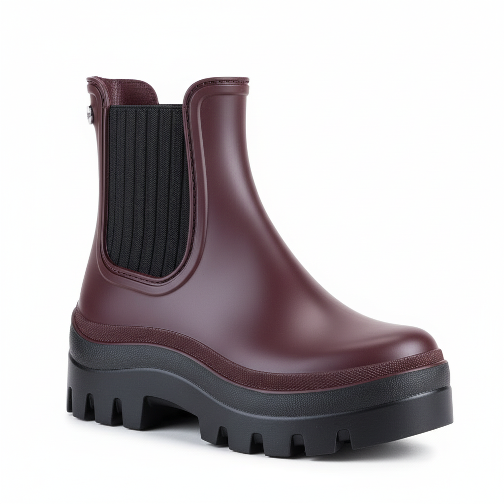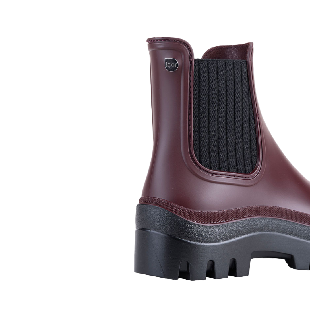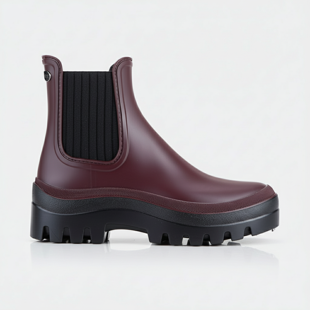 Bota de chuva monocromática estilo nórdico, com acabamento fosco, elástico nas laterais, palmilha confortável removível e forro em tecido.
