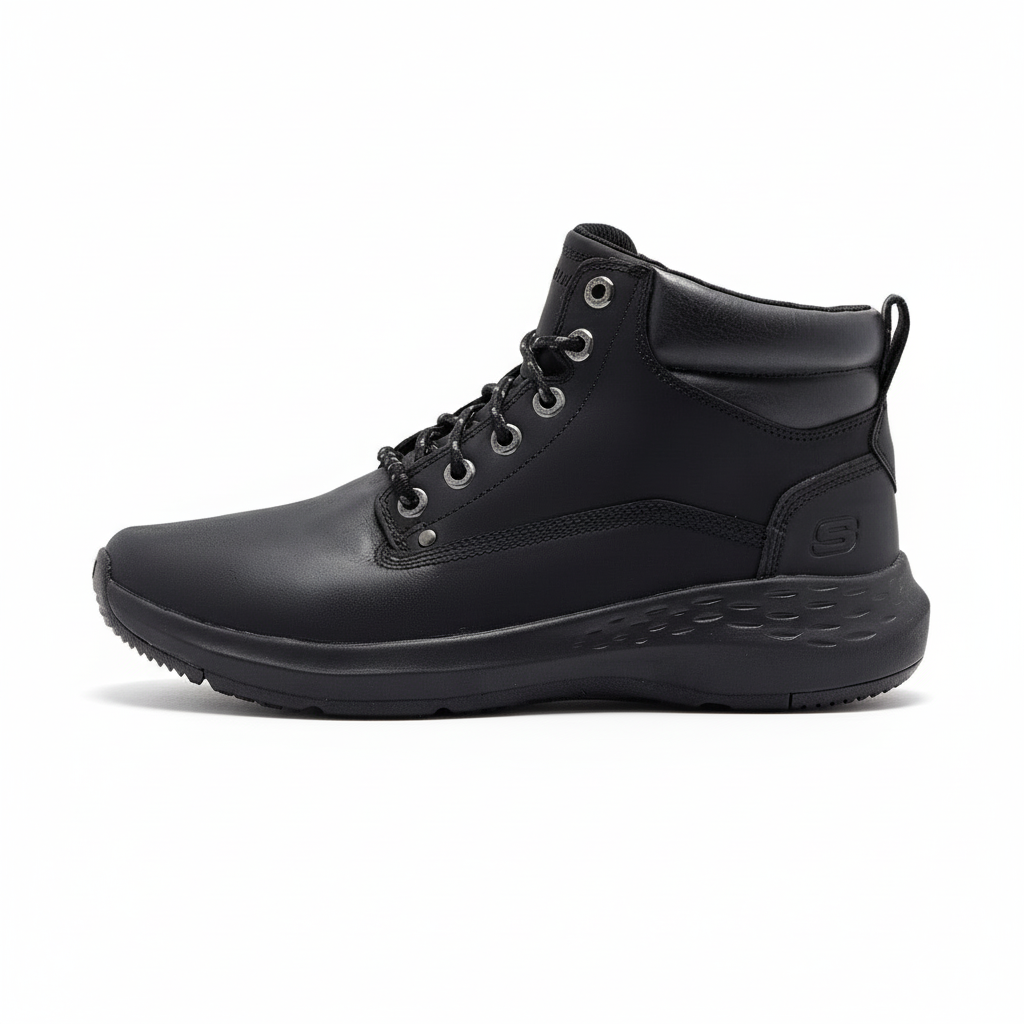 Conforto clássico combinado nas SKECHERS Relaxed Fit®: Parson - Ederic. Esta bota casual com atacadores tem a parte superior em pele e palmilhas Skechers Air-Cooled Memory Foam® com infusão de carvão e um Goga Mat Arch™ almofadado para mais apoio.
